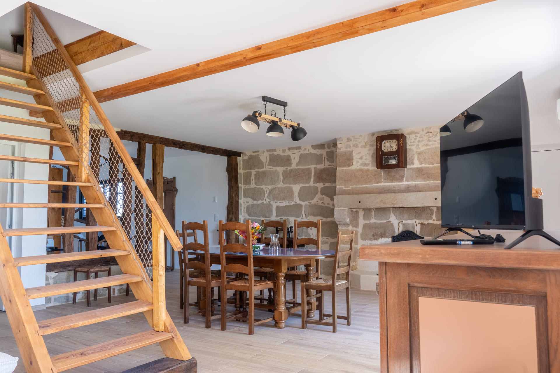Le salon ouvert est un véritable havre de paix, mettant en valeur une cheminée en pierre qui témoigne du caractère unique de ce gîte. La pièce est baignée de lumière, créant une atmosphère chaleureuse et accueillante.